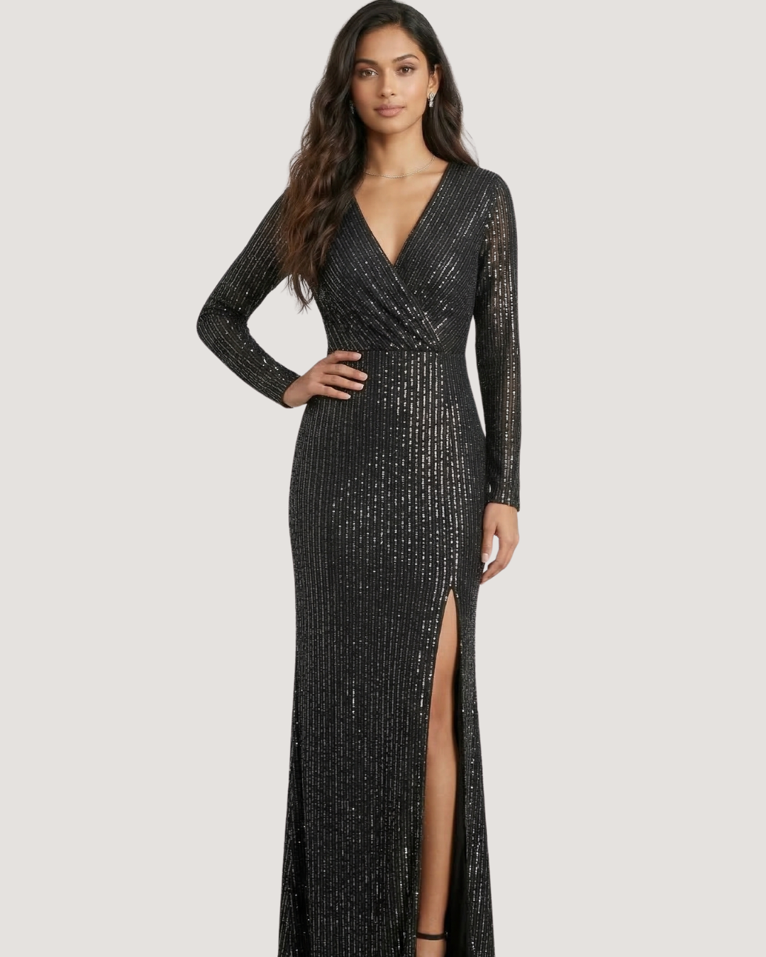 Step into elegance with theAva Radiance Long-Sleeve Sequin Dress — a sleek, event-ready gown designed to flatter from every angle. The wrap-style V neckline enhances the neckline beautifully, while the defined waist seam creates a sculpted silhouette that feels confident and polished. Full-length sleeves add a refined, classy edge, and the front slit brings effortless movement—perfect for walking, dancing, and making a graceful entrance.