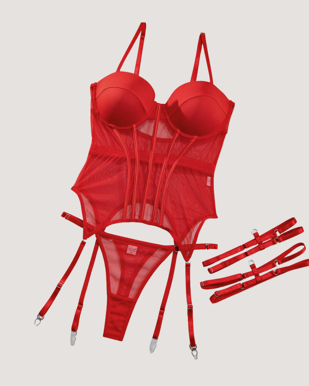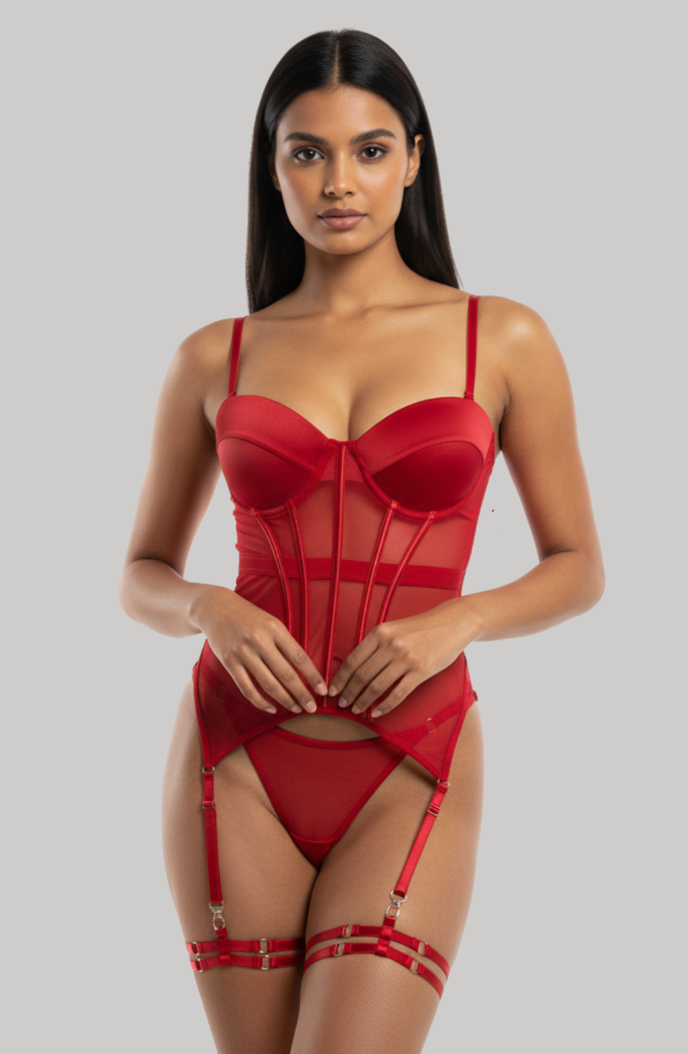Shine with irresistible allure in the Diamond Lace Dream Bodysuit — a breathtaking fusion of elegance and seduction. Designed in fiery red, this figure-sculpting piece features sheer mesh panels, structured boning, and daring garter straps that contour your curves to perfection.