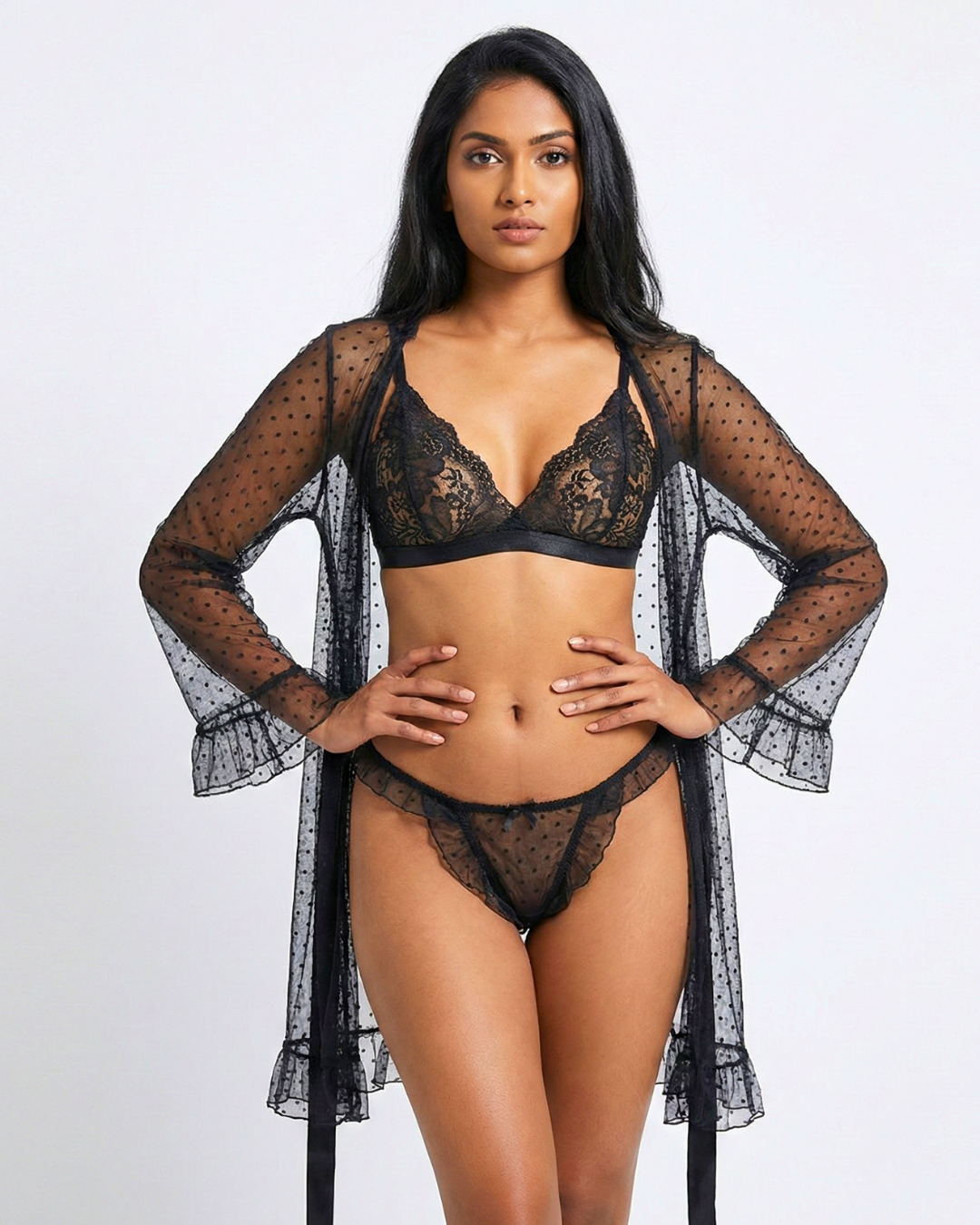 Elevate your nightwear game with the Dottie Desire Robe & Lace Set—a stunning 3-piece lingerie set designed for confident, feminine styling. This set features a lace bralette, a matching mesh panty, and a sheer dotted robe that adds instant boudoir elegance. The silhouette is romantic yet modern, giving you that luxe boutique feel—perfect for honeymoon packing, anniversary nights, stay-in date vibes, or simply treating yourself to something special. Lightweight, flattering, and effortlessly stylish, it’s made to look beautiful from every angle.