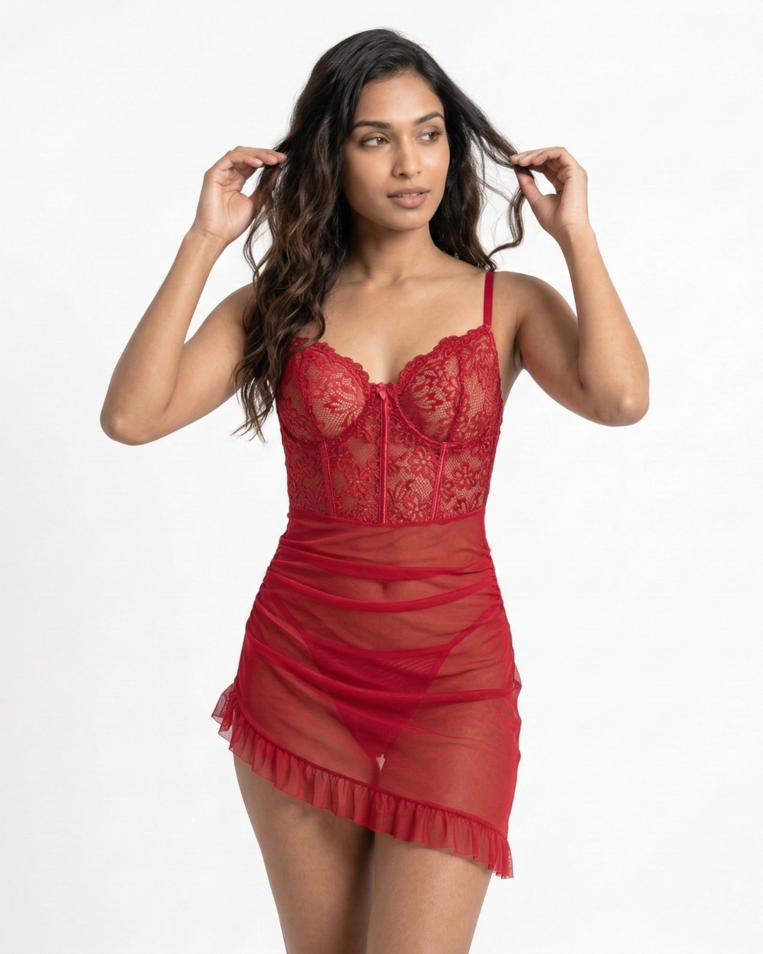 The semi-sheer fabric offers a hint of mystery, while the flirty ruffle details add a playful touch. Perfect for romantic evenings, this dress combines comfort and style, making it a must-have for your intimate wardrobe. Slip into this enchanting piece and let your confidence shine.