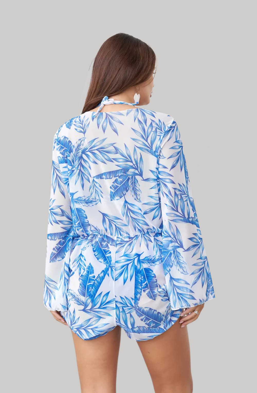 • A model wearing a white and blue floral 3-piece bikini set with a halter neckline and long sleeves.