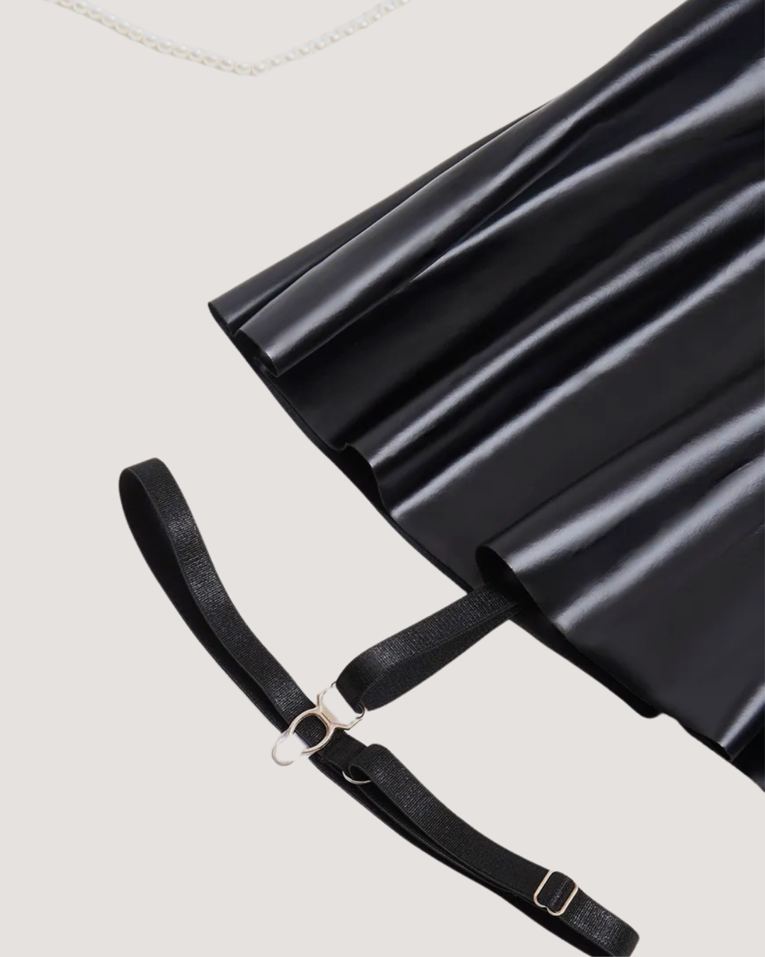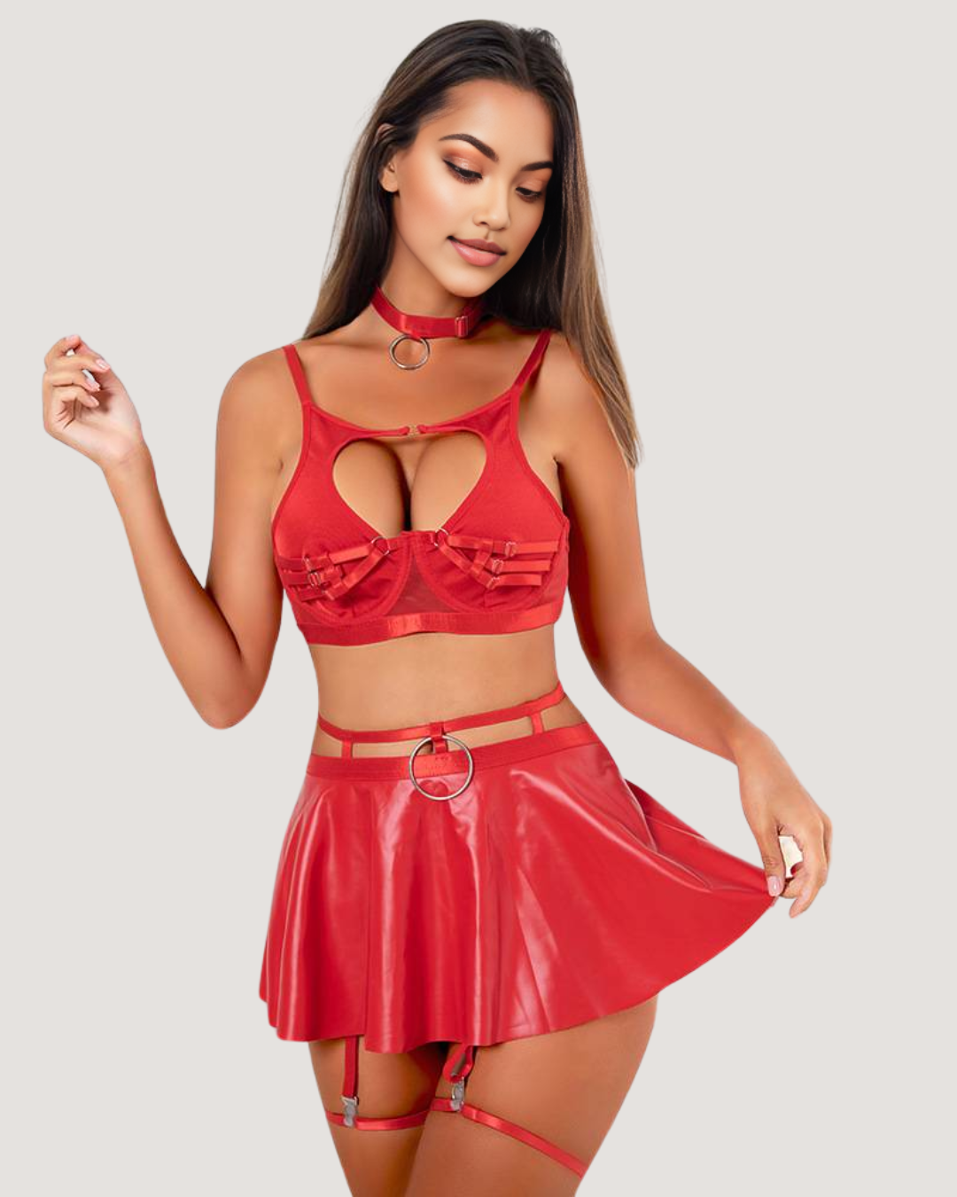This provocative ensemble features a sensually crafted lace bra set that contours to your curves, a sleek, solid-color leather skirt for an edgy touch, and matching fishnet stockings that add the perfect hint of allure.