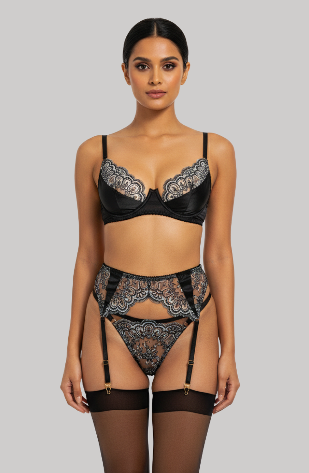 Own the night in the Midnight Baroque Lace Lingerie Set—a luxe 4-piece lingerie collection designed to sculpt, lift, and stun. The underwired bra shapes the bust with ornate baroque lace, while the high-waisted garter belt cinches the waist with sheer panels and gold-tone hardware.
