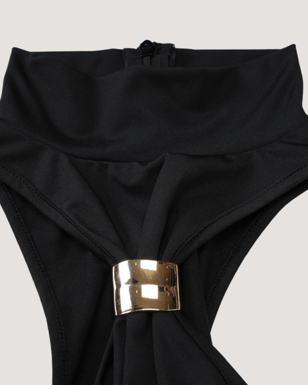 Own the room in the Midnight Halo Halter Dress—a minimalist black evening dress with maximum impact. The signature ring-halter neckline gathers the bust for a sculpted look, while the smooth stretch column silhouette streamlines from shoulder to hem. Floor-grazing length elongates the body; clean seams keep it modern and camera-ready. Pair with gold accents and strappy heels for galas, weddings, and every VIP night out.