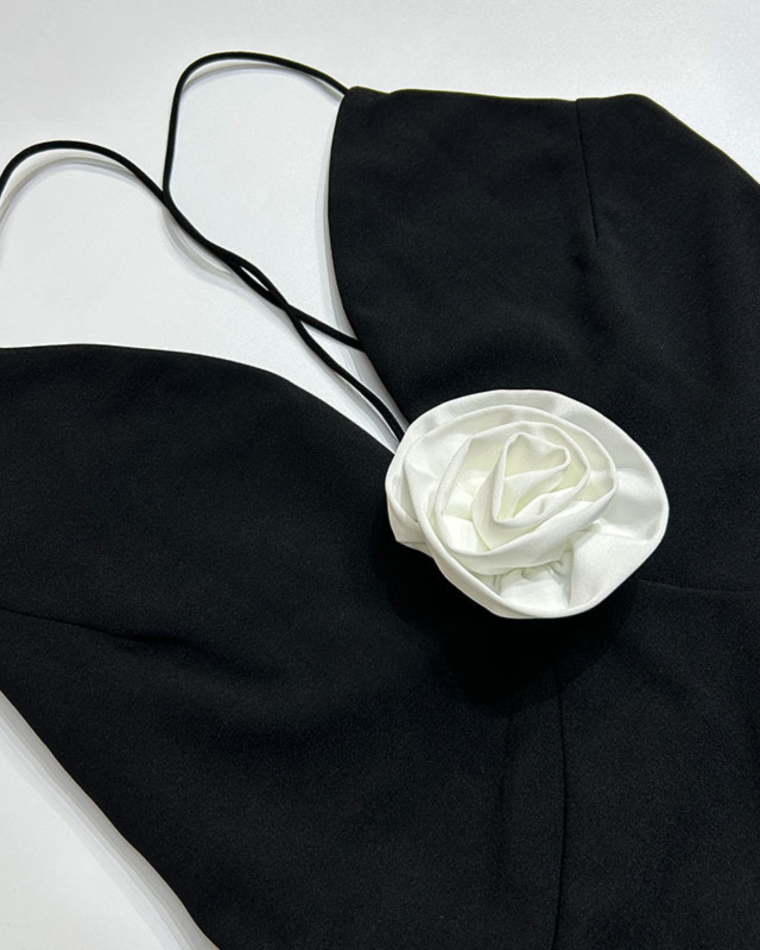 Own the evening in the Midnight Rose Plunge Maxi Dress by VC SECRET. Cut in a clean, body-skimming column silhouette, this gown features a daring deep-V neckline anchored by a couture-inspired white rosette that draws the eye and flatters the bust.