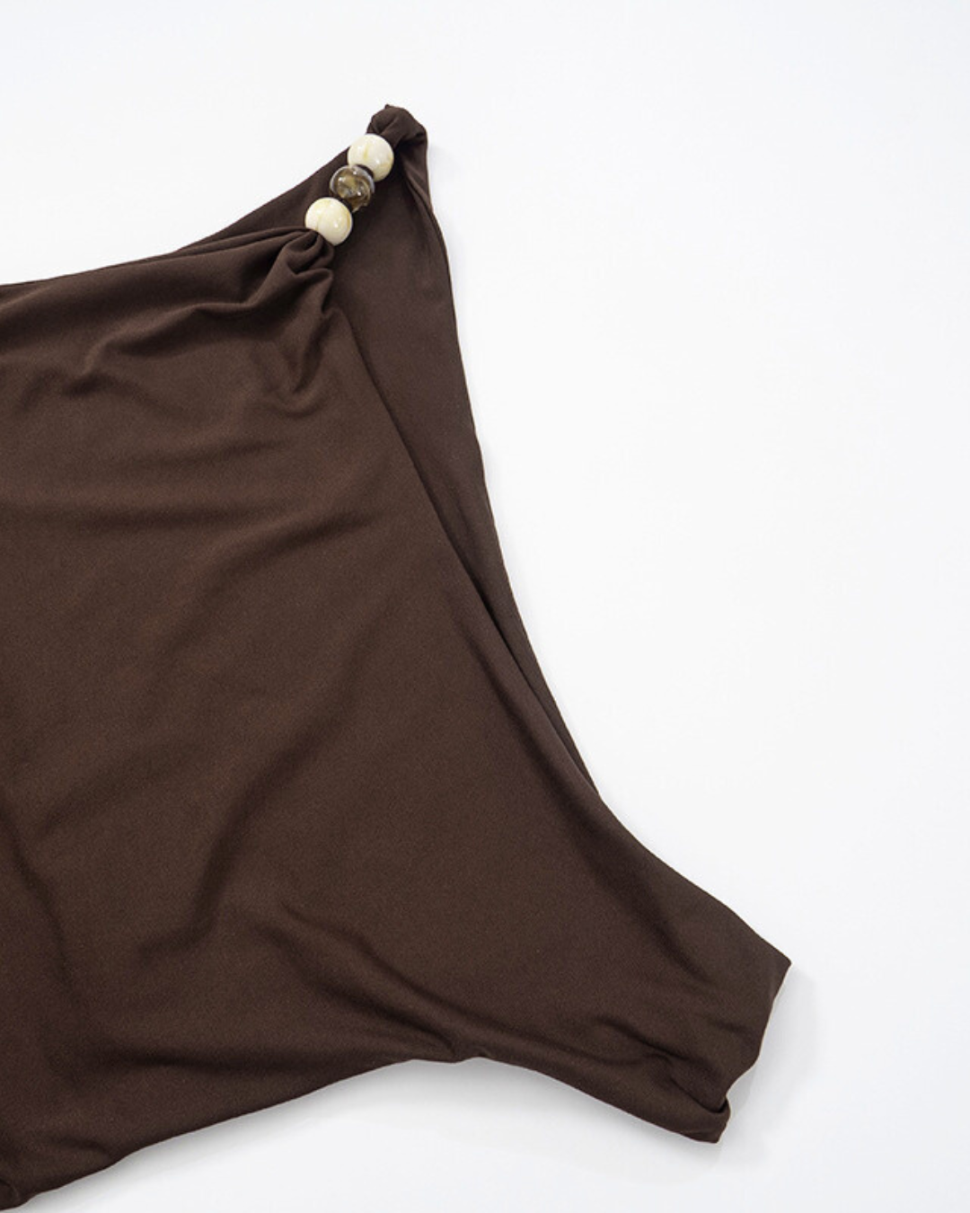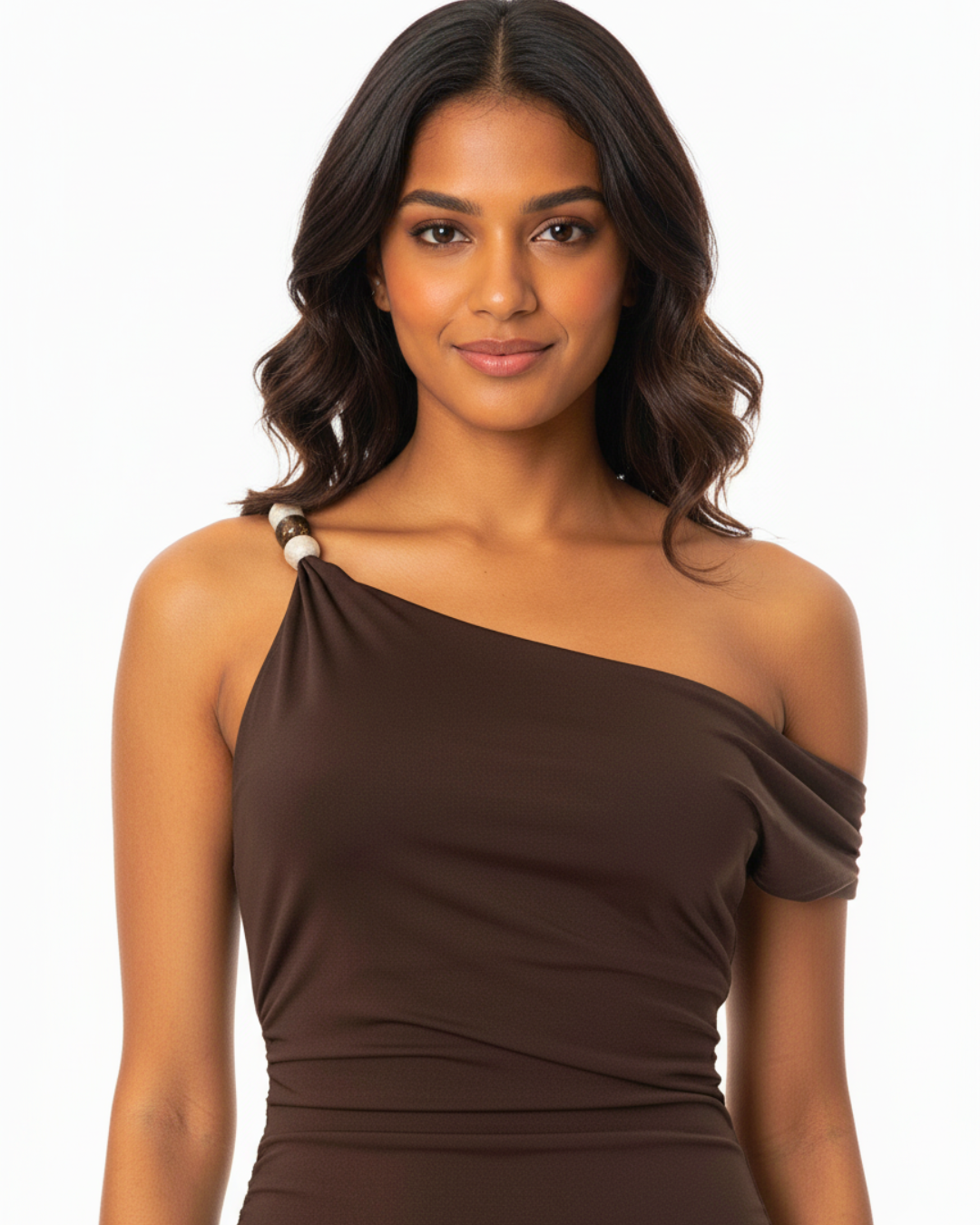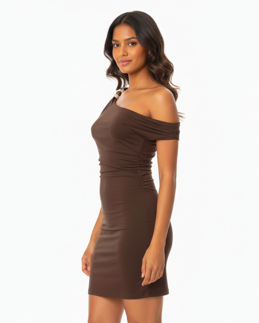 Meet the Mocha Muse One-Shoulder Mini Dress—a sleek, chocolate-brown bodycon that blends clean lines with curve-loving comfort. The asymmetric one-shoulder neckline is finished with a chic ring detail, while soft stretch jersey smooths the waist and hips without feeling tight. Mini length elongates your legs; the minimalist design pairs with gold hoops and strappy heels for an instantly polished, night-out look.