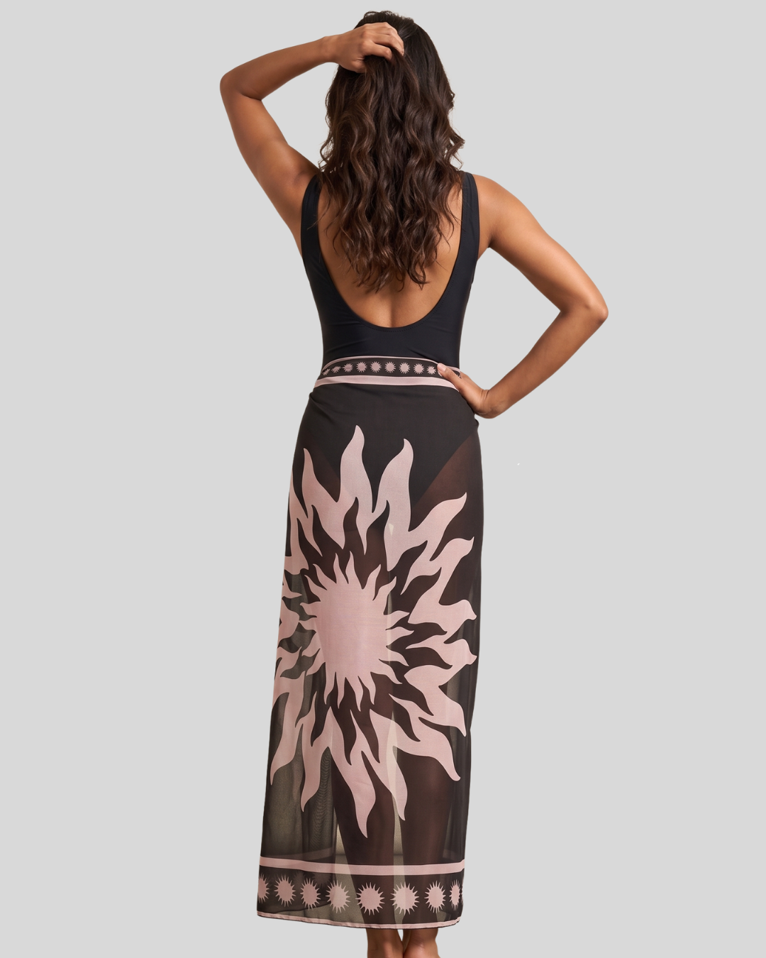 The one-piece features a sleek deep-neck silhouette that enhances the body beautifully, while the waist detail adds a stylish focal point and creates a more sculpted look. Paired with the flowing wrap cover-up, this set offers movement, comfort, and a touch of dramatic elegance that makes it perfect for beach holidays, poolside lounging, luxury resort wear, and tropical getaways.