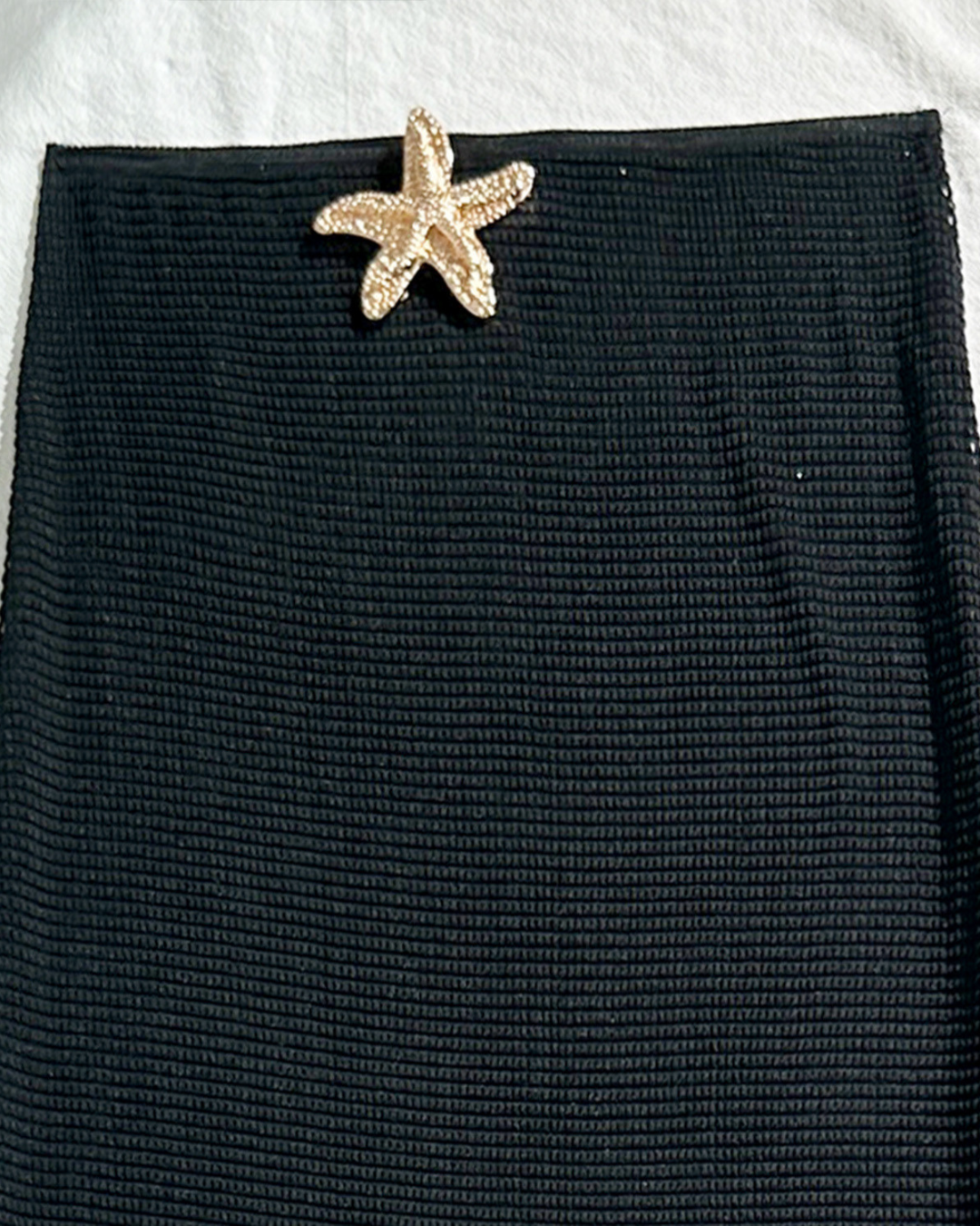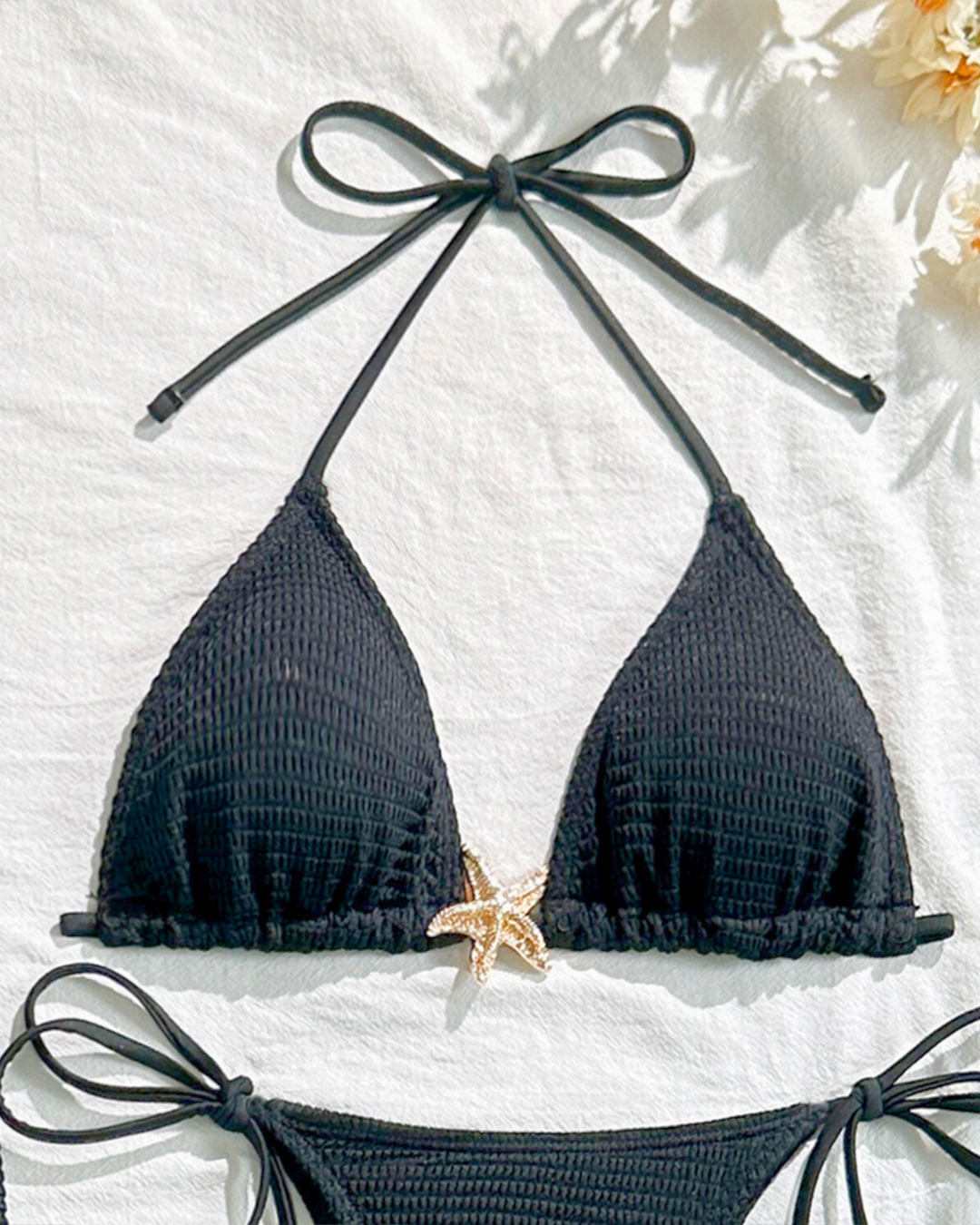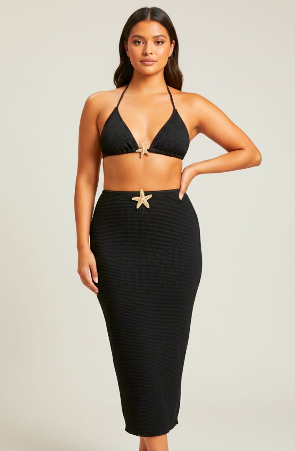Shine with seaside elegance in the Starfish Glow 3-Pieces Bikini Set. This chic set includes a flattering halter bikini top, matching bottom, and a sleek high-waisted skirt — all brought to life with dazzling gold starfish accents. Designed in classic black for a timeless look, the set blends luxury with beach-ready confidence.