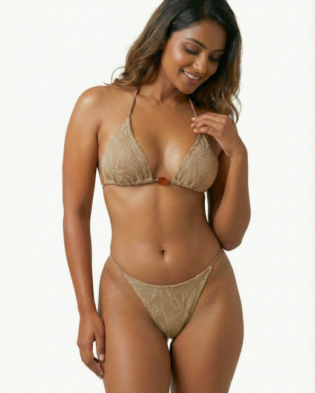 The adjustable triangle halter top lets you control the fit and coverage, while the tie-side high-leg bottom offers flexible sizing and a sleek, leg-lengthening shape. Whether you’re heading to Mirissa, Unawatuna, Hikkaduwa, Nilaveli, Pasikudah, or Arugam Bay, this set looks stunning in photos and feels confident from every angle.